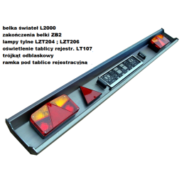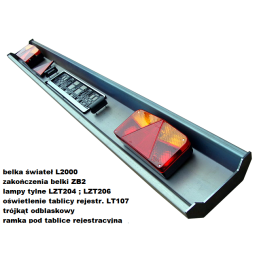 Belka świateł - zderzak pod światła w raz z lampami długość L2000 - grubość blachy 2 mm - (dostępne też inne długości oraz grubość blachy 3 mm) zakończenia belki ZB2 - 2szt. lampy tylne LED - 2szt obrysówki LED na wysięgniku krótkim - 2szt podświetlenie tablicy rejestracyjne LED 2 szt - LTD702, ramka pod tablice rejestracyjną, Czytaj poniżej opis