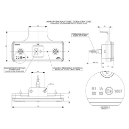 Lampa diodowa (LED) tak Kategoria lampy obrysowa Grupa lamp HOR 24 Strona montażu uniwersalna Napięcie zasilające 12/24 V Moc znamionowa 0,5/1 W Przewód 2×0,75 mm2; długość przewodu 0,45 m Ilość diod LED 4 Światło pozycyjne przednie tak Odblask tak Zakres temperatury pracy od -30°C do +50°C