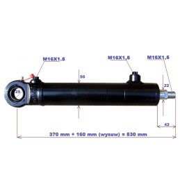 Siłownik dwustronnego działania Wymiary: - Długość siłownika złożony 530 mm - Całkowita długość siłownika po rozłożeniu 850 mm - Skok / wysuw tłoczyska 320 mm - Średnica tłoczyska 22 mm - Otwory na sworzeń 25 mm - Średnica zew. siłownika 50 mm - Ciśnienie nominalne 16 MPa Wymiary podane na rysunku UWAGA!!!! Cylinder posiada typowe uszczelki. Można je...